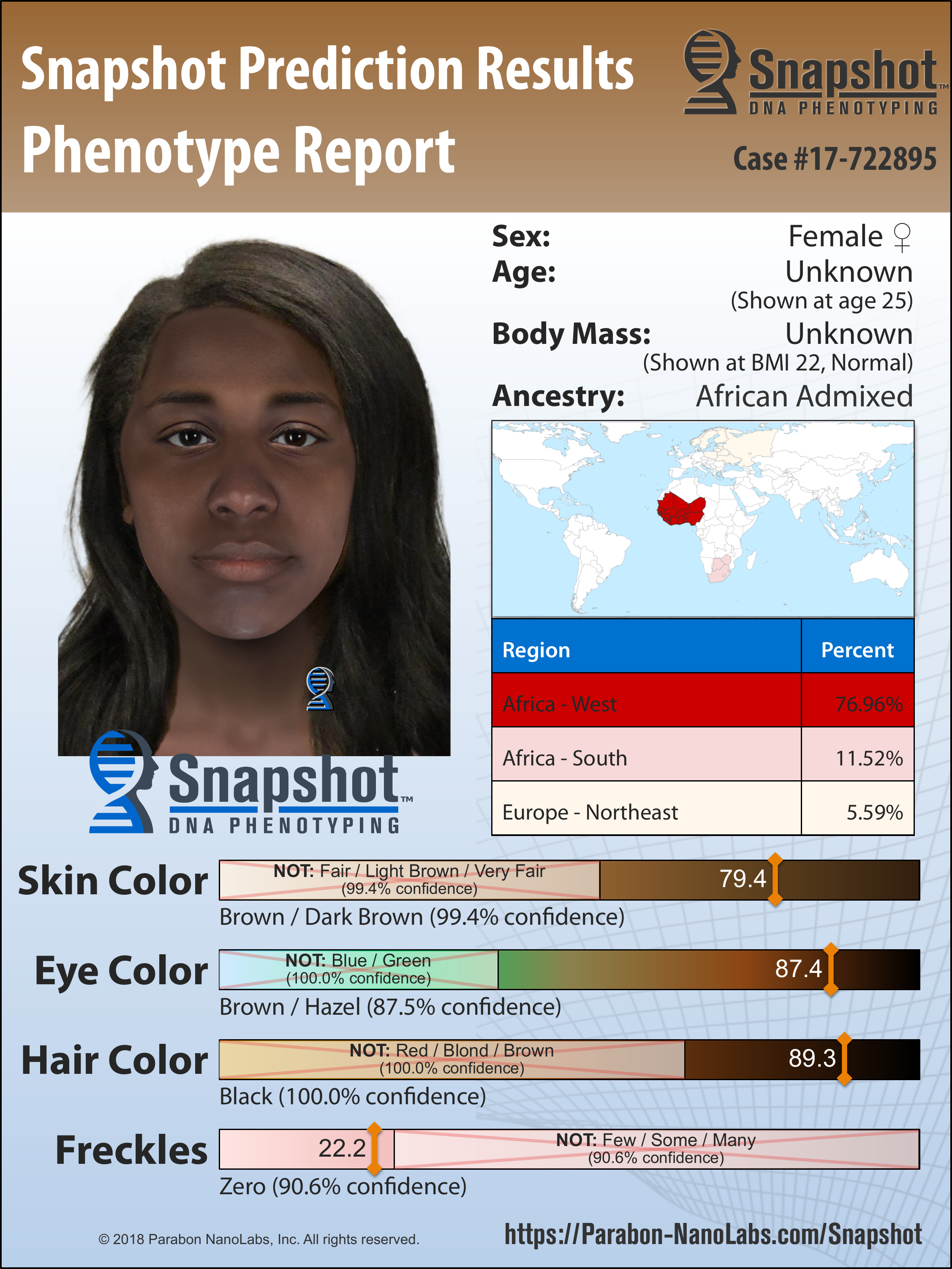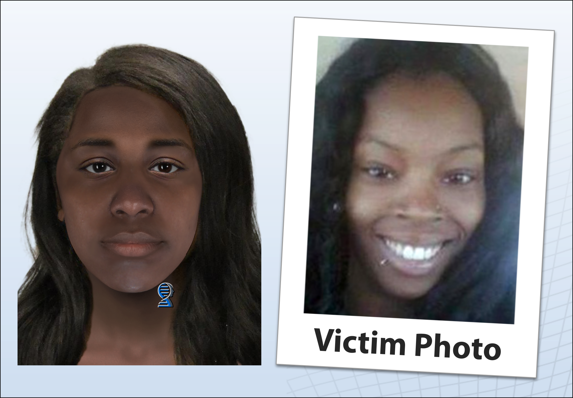Snapshot's analysis of the DNA indicated the victim was of African American ancestry, with brown to dark brown skin, brown eyes, black hair, and no freckles. Thom Shaw, a certified forensic artist at Parabon, performed a facial reconstruction from the victim's skull and digitally combined it with the DNA predictions in order to generate an image of how the victim may have looked when she was alive. "The ability to fine tune a Snapshot composite with details from a skull gives a more fully-informed likeness of an unidentified victim," says Shaw.