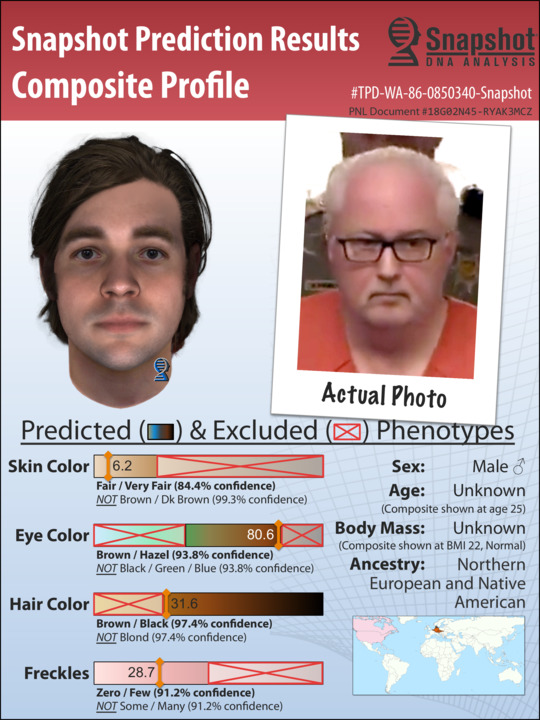 In May of 2016, Parabon delivered Snapshot Phenotype reports to the members of the task force. The DNA showed that although both men were Caucasian, trait predictions suggested they had notable phenotypic differences. The suspect for the Michella Welch case was predicted to most likely have fair skin, brown eyes, and brown hair. Additionally, while both men were of predominantly Northern European ancestry, the suspect in the Welch case had a small but notable amount of Northern Native American admixture (~9%).